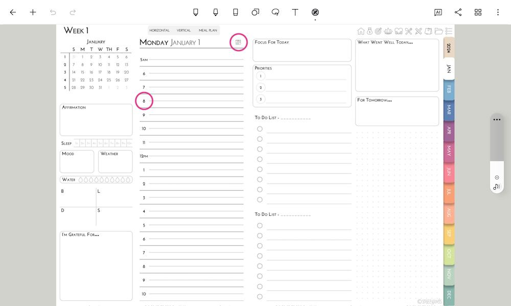 Once your planner is imported to Noteshelf, Samsung Notes, etc., open up your planner to either a monthly calendar or daily planner page. You will find Calendar Icons on both!